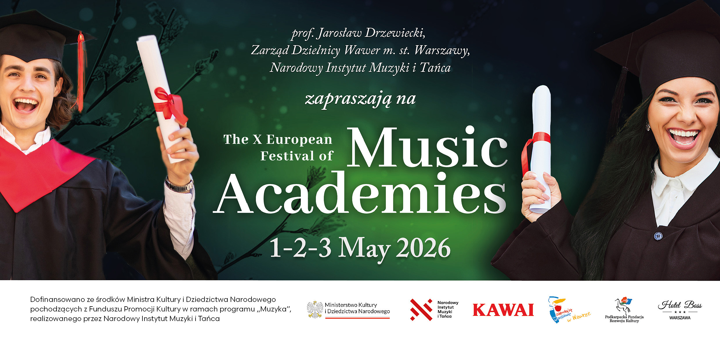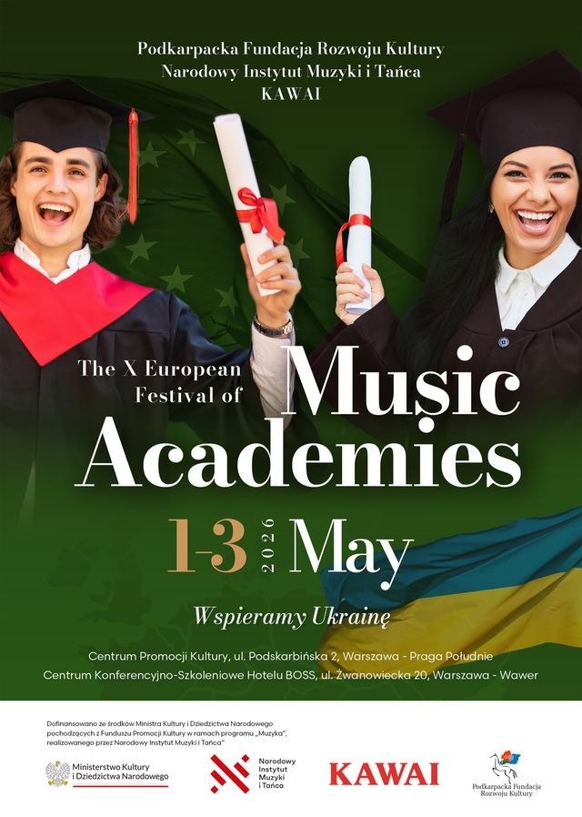 Podkarpacka Fundacja Rozwoju Kultury serdecznie zaprasza na koncerty w ramach X edycji Europejskiego Festiwalu Akademii Muzycznych, które odbędą się w Warszawie - w sali koncertowej Hotelu BOSS, ul. Żwanowiecka 20 - w dniach od 1 do 3 maja 2026 roku. Festiwal to wyjątkowa okazja, by wysłuchać utalentowanych studentów i artystów reprezentujących prestiżowe uczelnie muzyczne z Europy.